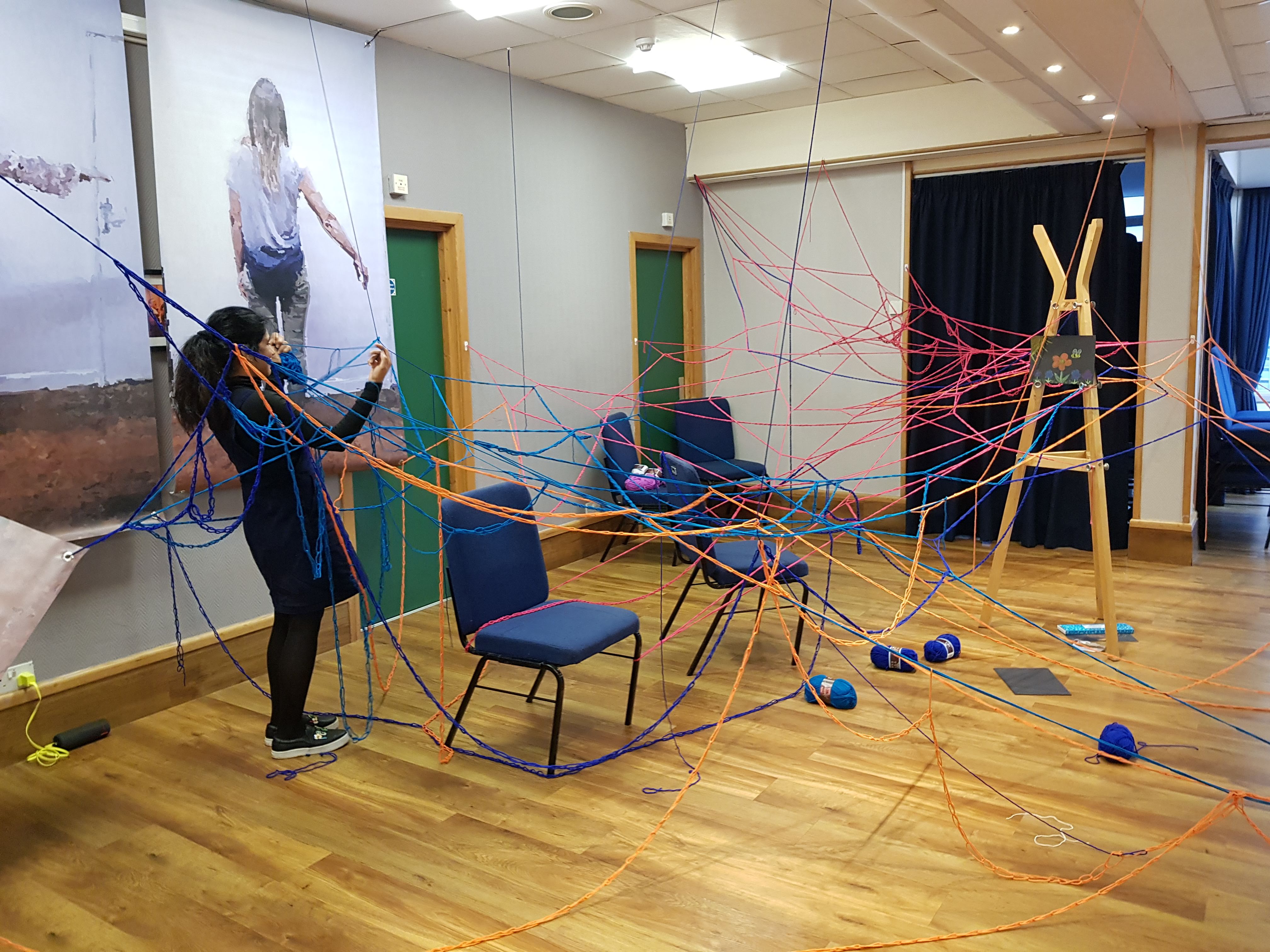 Previous ImageNext Image 20181019_174112 Unfinished 2018 Barbara Touati-Evans, Susan Merrick and Audience – A growing and changing installation created for the space at Princes Hall, Aldershot.